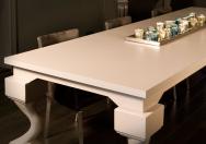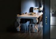 Deze tafel combineert een strak vormgegeven blad met de bijzondere vorm van de tafelpoten.